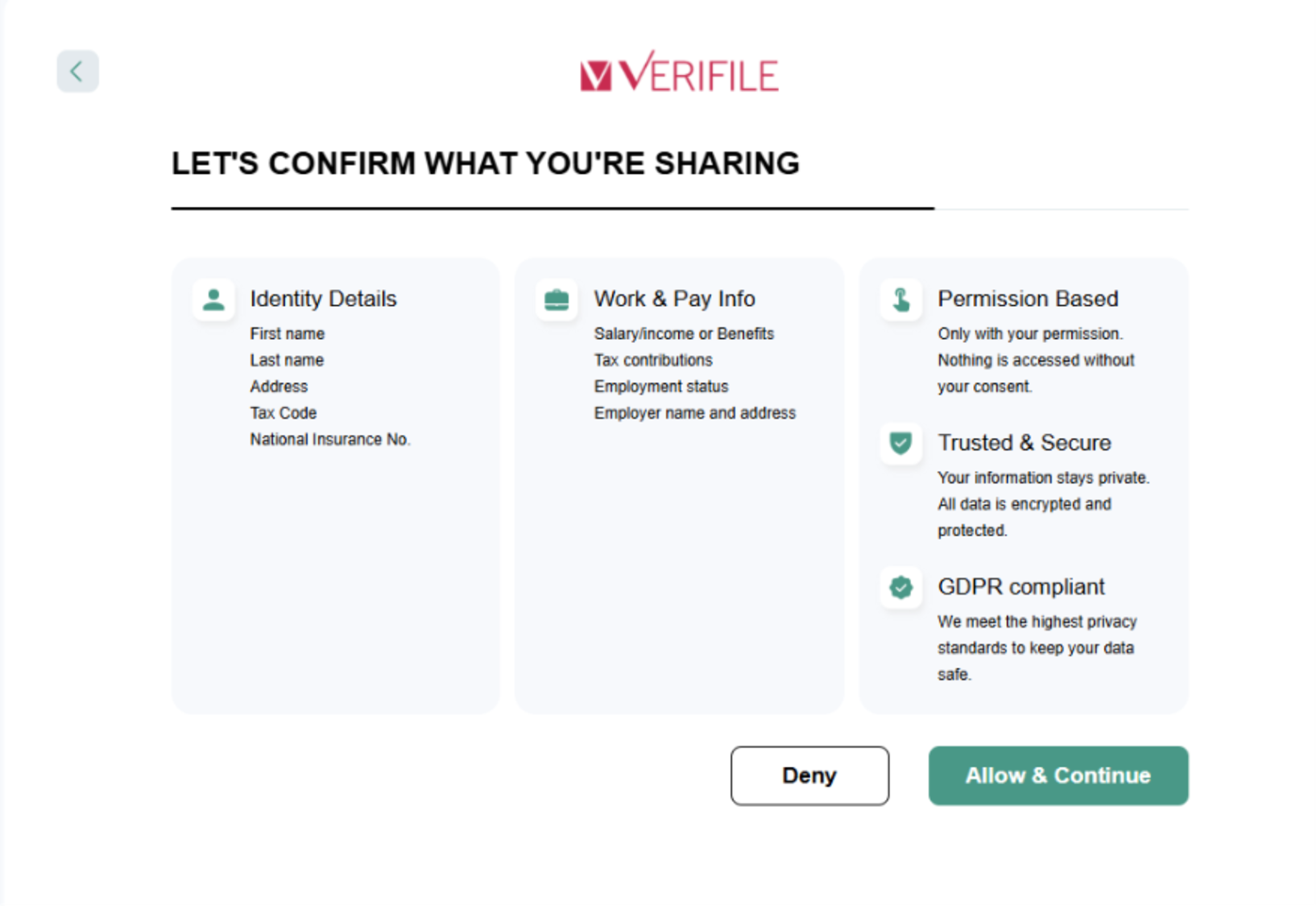 The next screen will confirm what the check is requesting that they should share with us and only for that purpose. Allow & Continue on this screen.