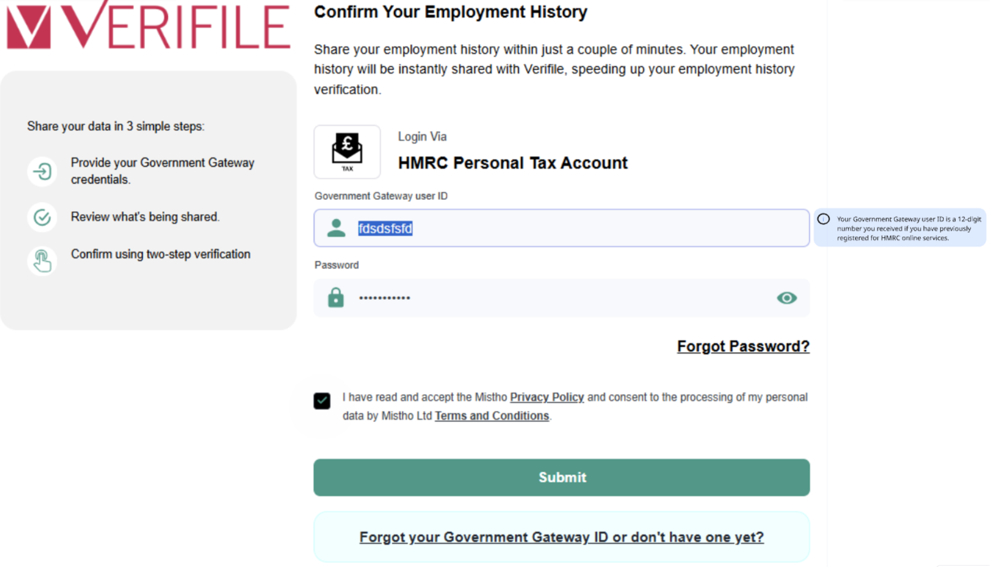The candidate will be required to log in securely to their HMRC Personal Tax Account.